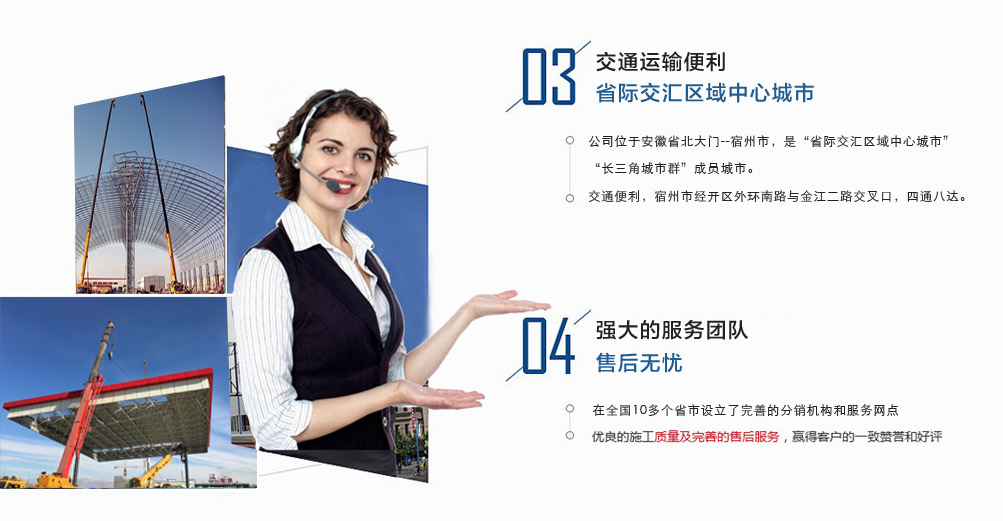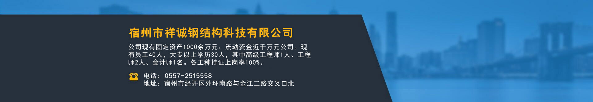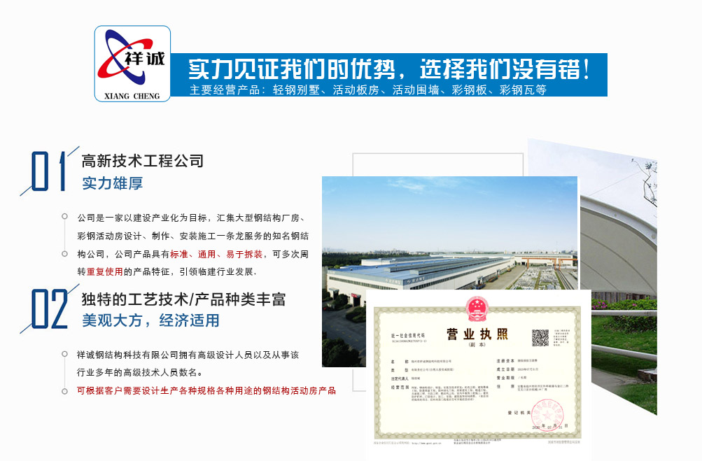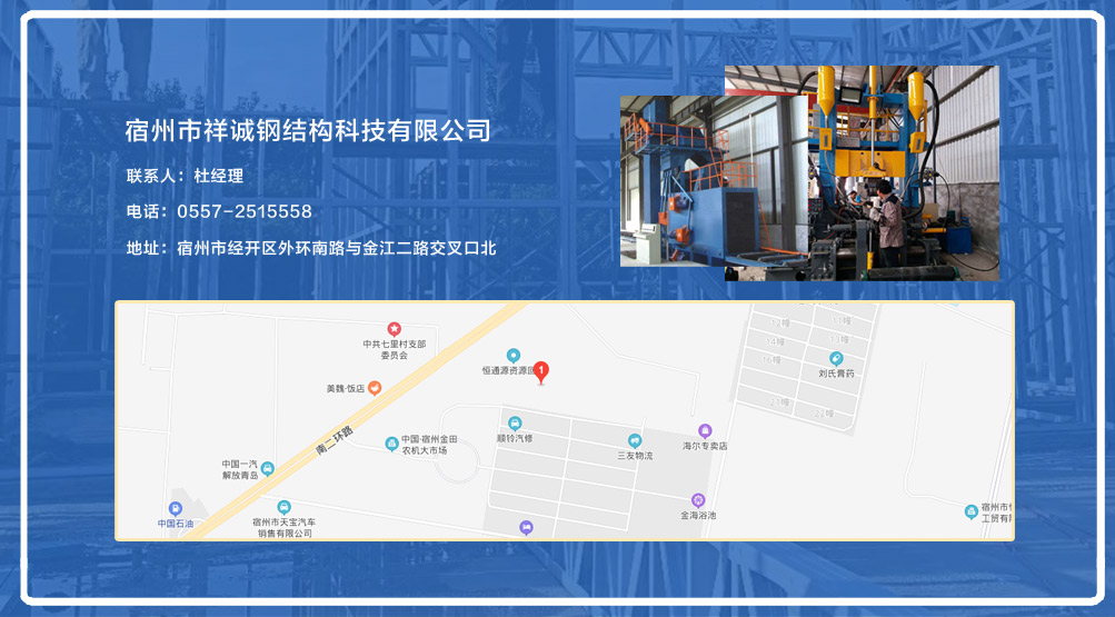 宿州市祥誠鋼結構科技有限公司位于宿州市經開區外環南路與金江二路交叉口北,公司是一家以建設產業化為目標,匯集大型鋼結構廠房、彩鋼活動房設計、制作、安裝施工一條龍服務的知名鋼結構公司。公司現有固定資產1000余萬元、流動資金近千萬元公司。現有員工40人,大專以上學歷30人,其中高級工程師1人、工程師2人、會計師1名。各工種持證上崗率100%。高效化的年青團隊為公司帶來了蓬勃發展的動力,全體員工以務實的態度,拼搏的精神,創造著企業的每一天。 公司組織結構嚴格按現代企業制度設計,管理機構設置合理,制度完善,各部門分工明確...